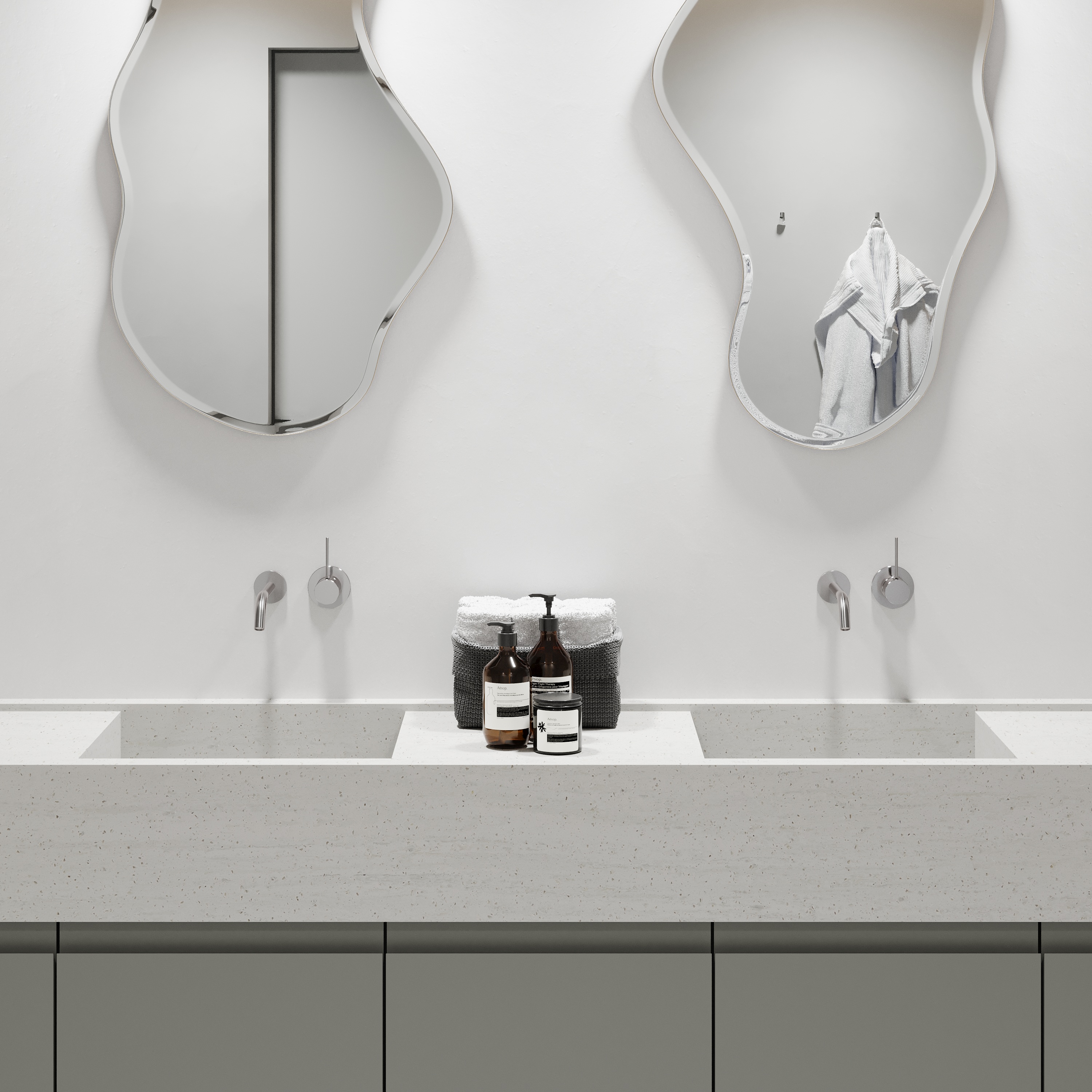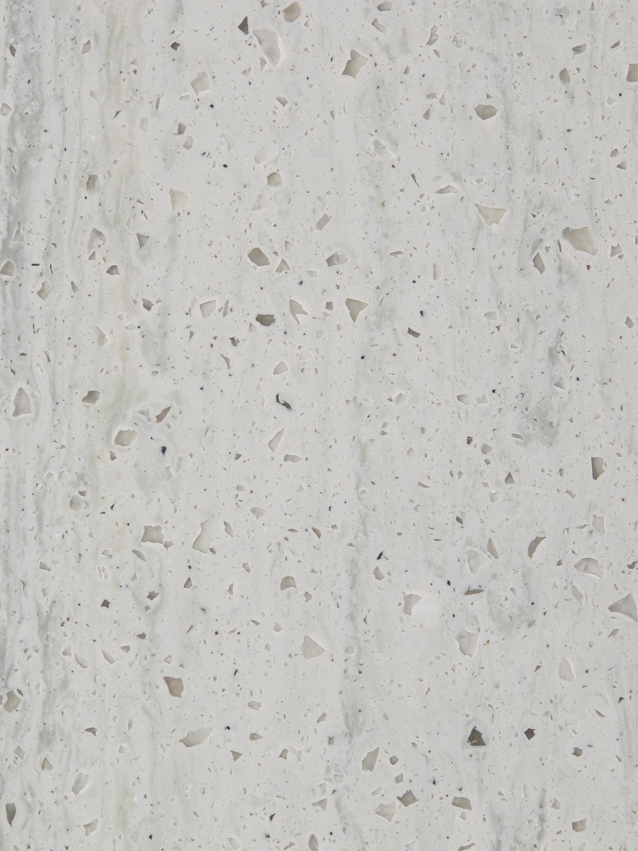 Decor DM5017 Grigio van Durasein® toont een subtiel, vloeiend lijnenspel in een licht beige solid surface basis met een koele ondertoon welke wordt doorbroken met kleine glasachtige korrels.