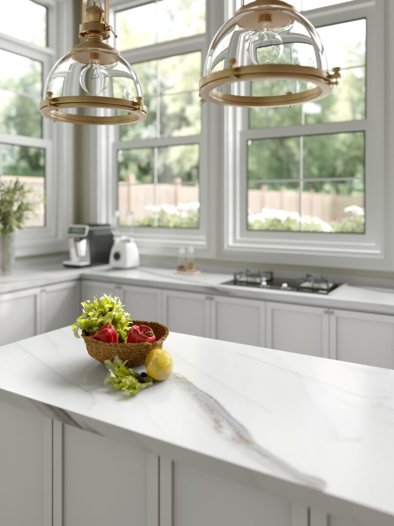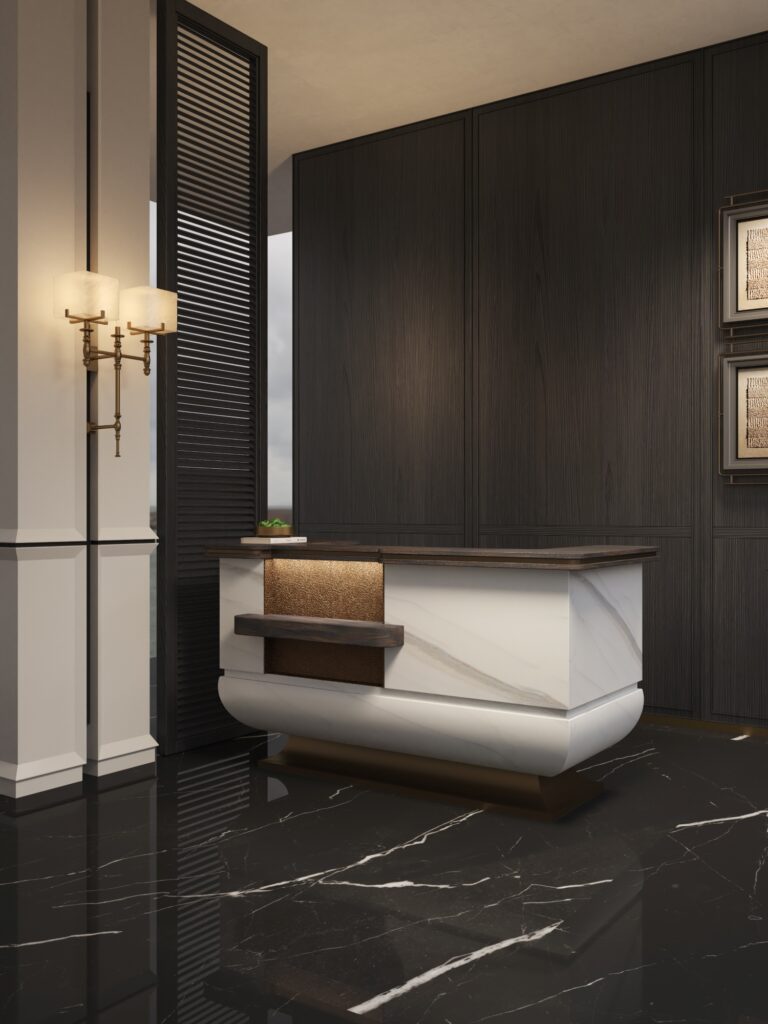 Solid surface decor DM5048 Starstruck van Durasein® biedt de luxe uitstraling van marmer op een warm witte basis. De zachte grijsbruine aders bevatten subtiele glanzende vezels, wat zorgt voor een verfijnde en eigentijdse uitstraling.