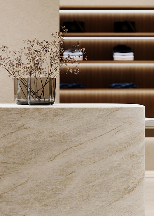 In tegenstelling tot natuurlijk marmer is ItalianStone HPL een gesloten en niet poreus oppervlak met een matte afwerking. De onregelmatige structuur – welke bij natuursteen wordt bereikt door bush hammering – versterkt de natuurlijke uitstraling.